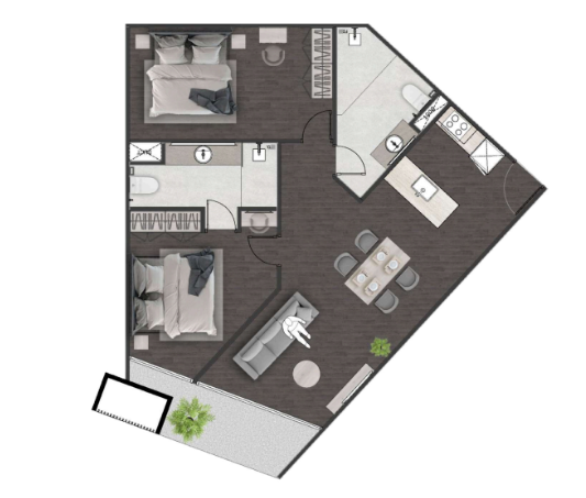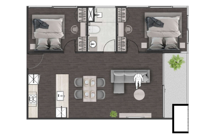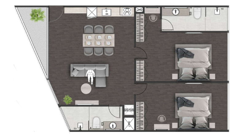 Проект расположен в спокойном районе Раваи, в окружении зелени и с удобным доступом к пляжу Найхарн, магазинам, школам и кафе. До пляжа — всего 9 минут на транспорте.
