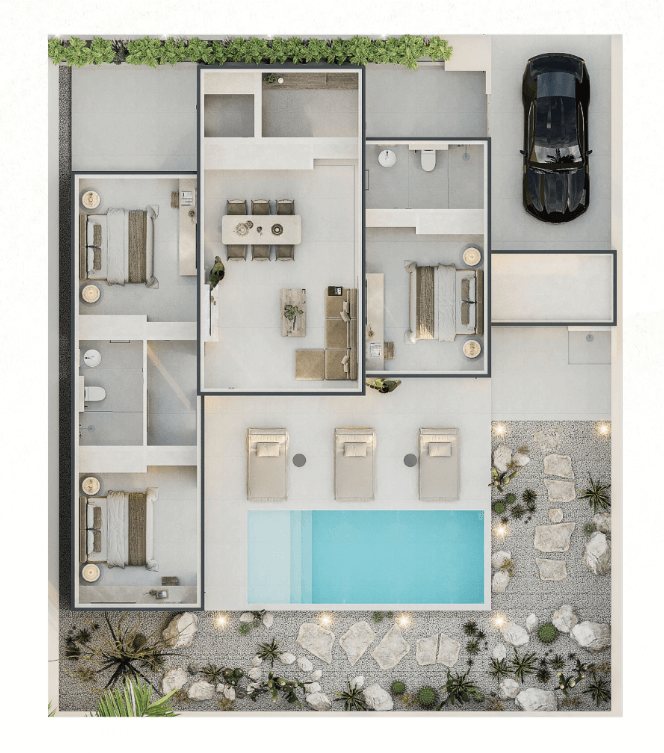 Проект предлагает одно- и двухэтажные виллы с 2, 3 или 4 спальнями, каждая из которых выполнена в современном стиле с приватным бассейном, террасой и ландшафтным озеленением. Участки — от 185 до 220 м², жилая площадь — от 150 до 300 м².