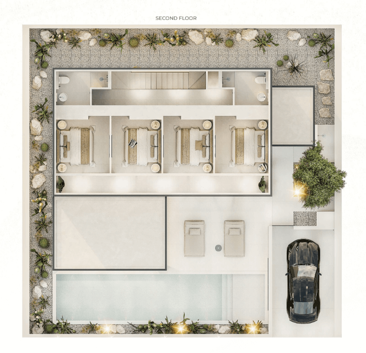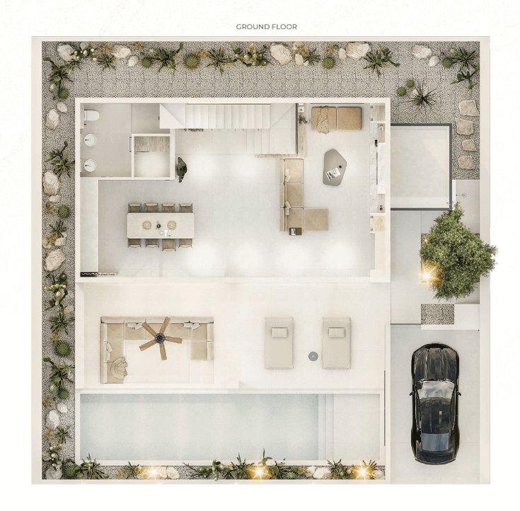 Проект предлагает одно- и двухэтажные виллы с 2, 3 или 4 спальнями, каждая из которых выполнена в современном стиле с приватным бассейном, террасой и ландшафтным озеленением. Участки — от 185 до 220 м², жилая площадь — от 150 до 300 м².
