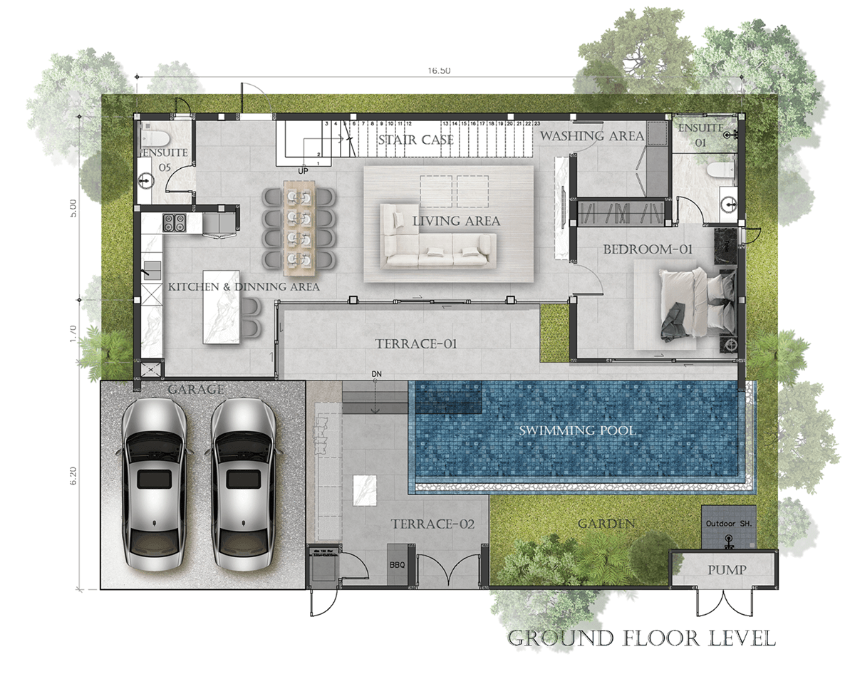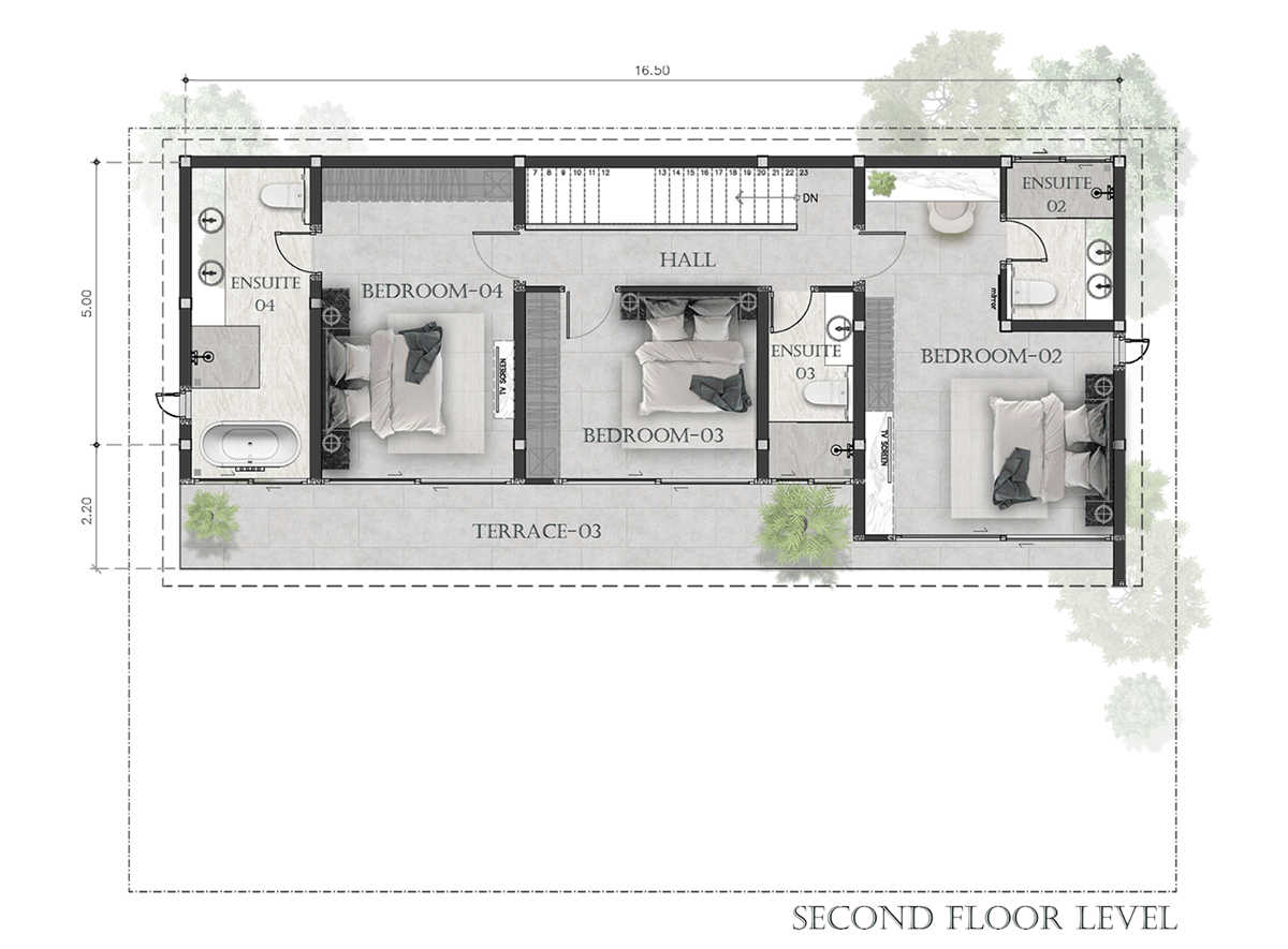 Просторные 4-спальные резиденции выполнены в двух вариантах: с приватным руфтопом или без, каждая с собственным бассейном, зоной барбекю, террасой и парковкой на 2 авто.