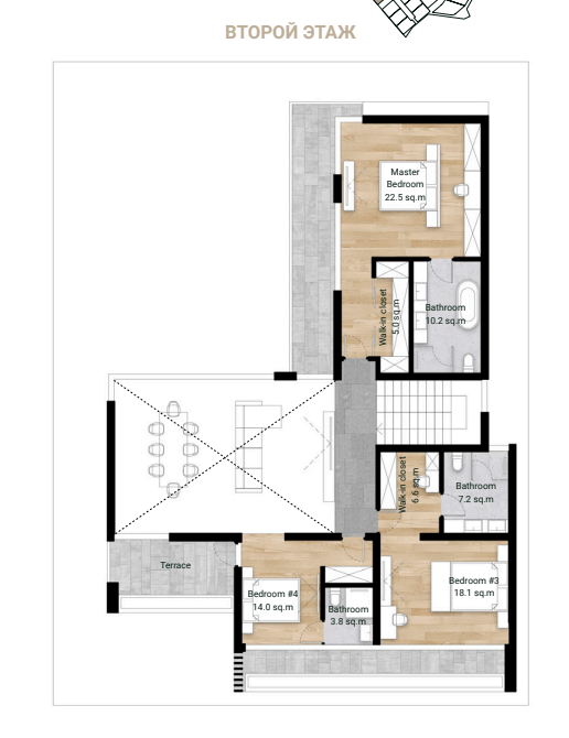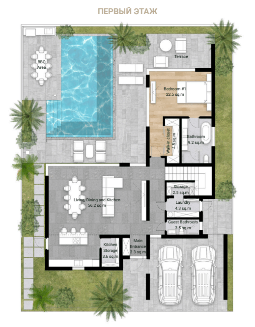 Проект предлагает типовые планировки с 3 и 4 спальнями, при этом архитектура адаптируется под реальную жизнь: кладовые, гардеробные, постирочные, приватные санузлы у каждой спальни, панорамные окна в зоне кухни и гостиной. Площади застройки варьируются от 326 до 512 м².