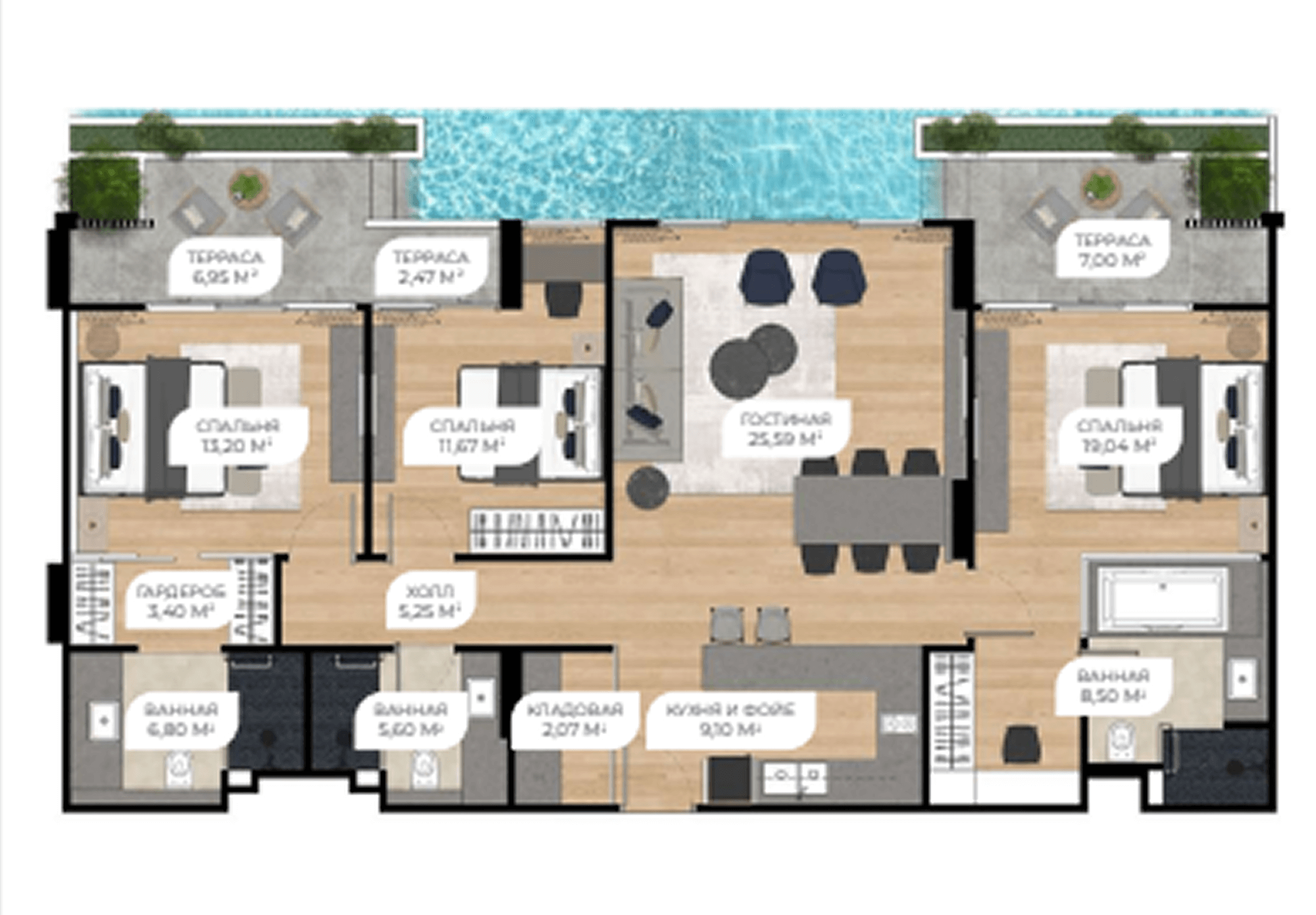 - Развитая инфраструктура: на территории комплекса предусмотрены бассейны, рестораны, кафе, бары, супермаркет, спа, фитнес-центр и многофункциональные зоны для проведения мероприятий.