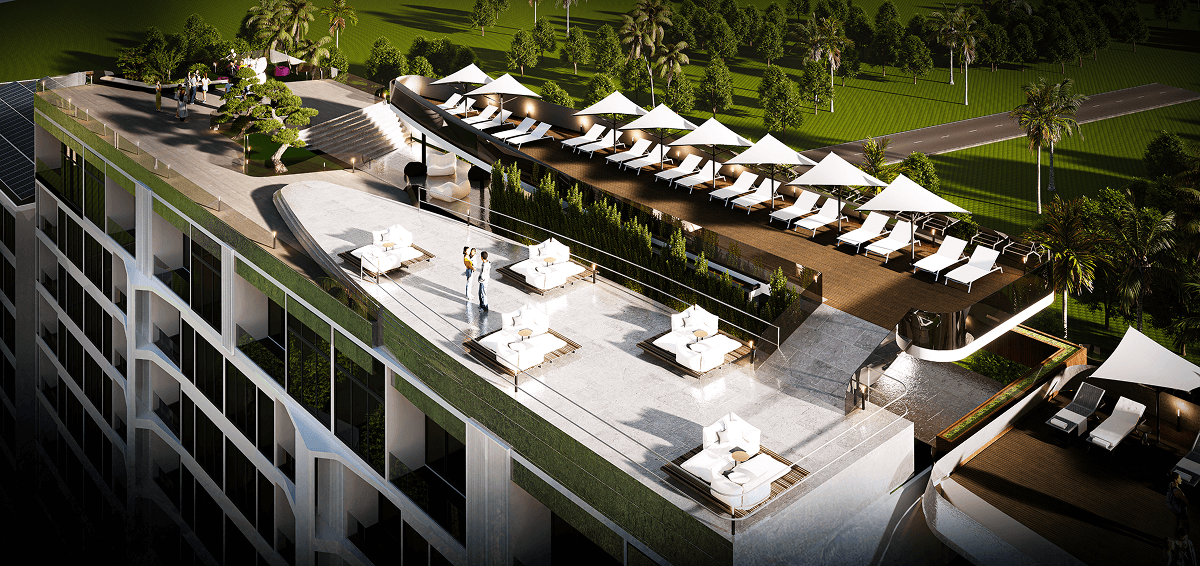 Благодаря выгодной локации в 5 минутах от пляжа Найхарн и приподнятому рельефу, проект предлагает захватывающие виды на море и зелёные холмы, а с крыши открывается панорамный обзор южной части острова.