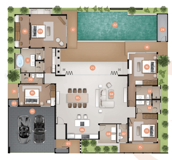 Проект предлагает виллы с 3 или 4 спальнями, на участках от 320 до 600 м². Планировки продуманы до мелочей: от скрытых прачечных и кладовых до открытой кухни с выходом к террасе и бассейну. Пространства внутри — живые, дышащие, наполненные светом. Здесь нет ненужной показной роскоши — но есть ощущение, что всё на своём месте.